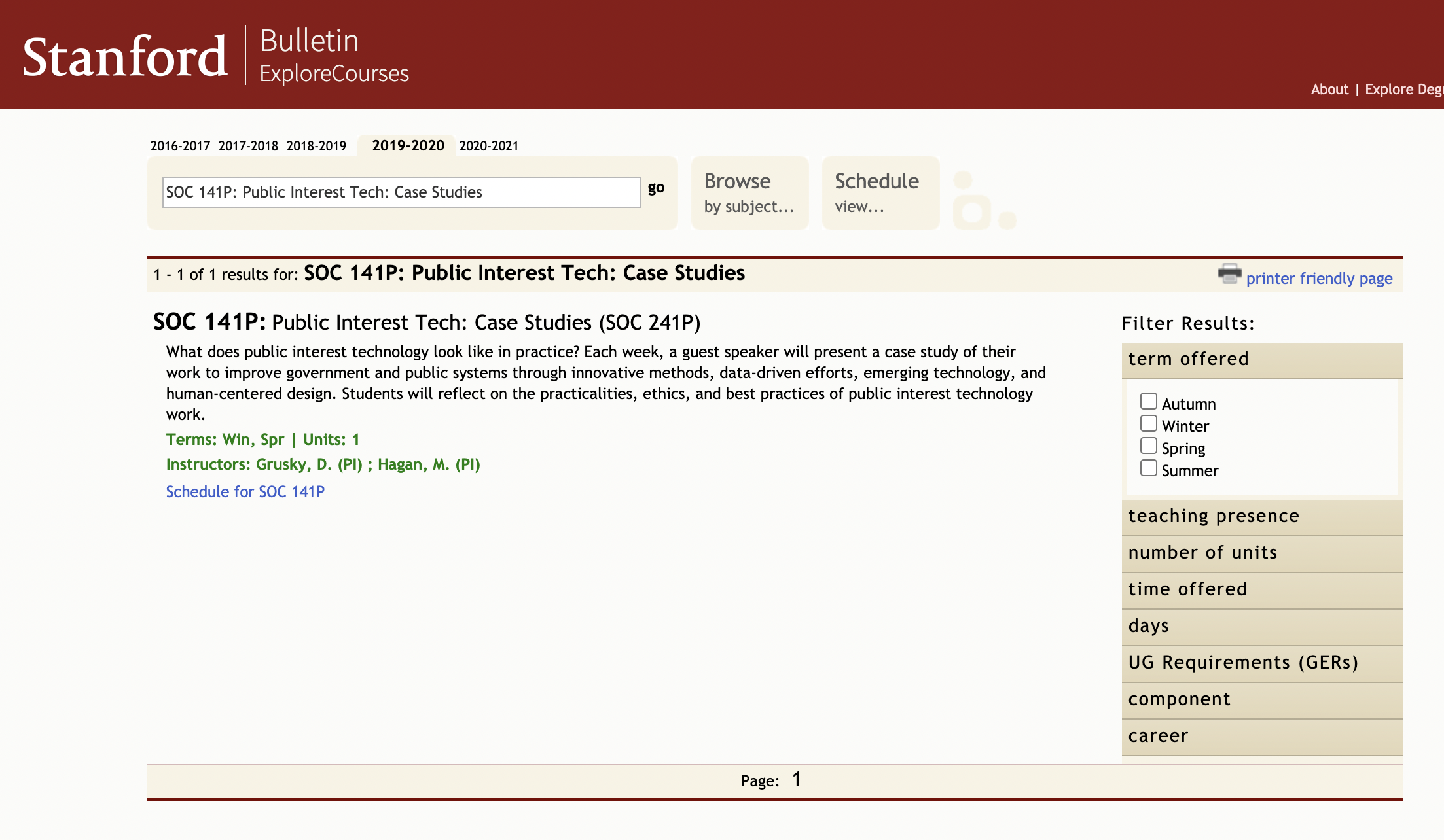 Stanford University has offered “Public Interest Tech: Case Studies” classes through its Sociology Department over three quarters.